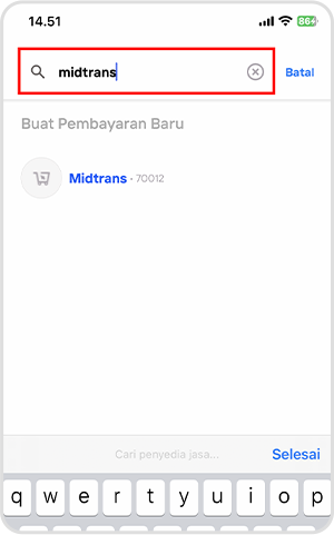 3. Cari penyedia jasa “MIDTRANS” pada kolom pencarian. Lalu pilih Midtrans.